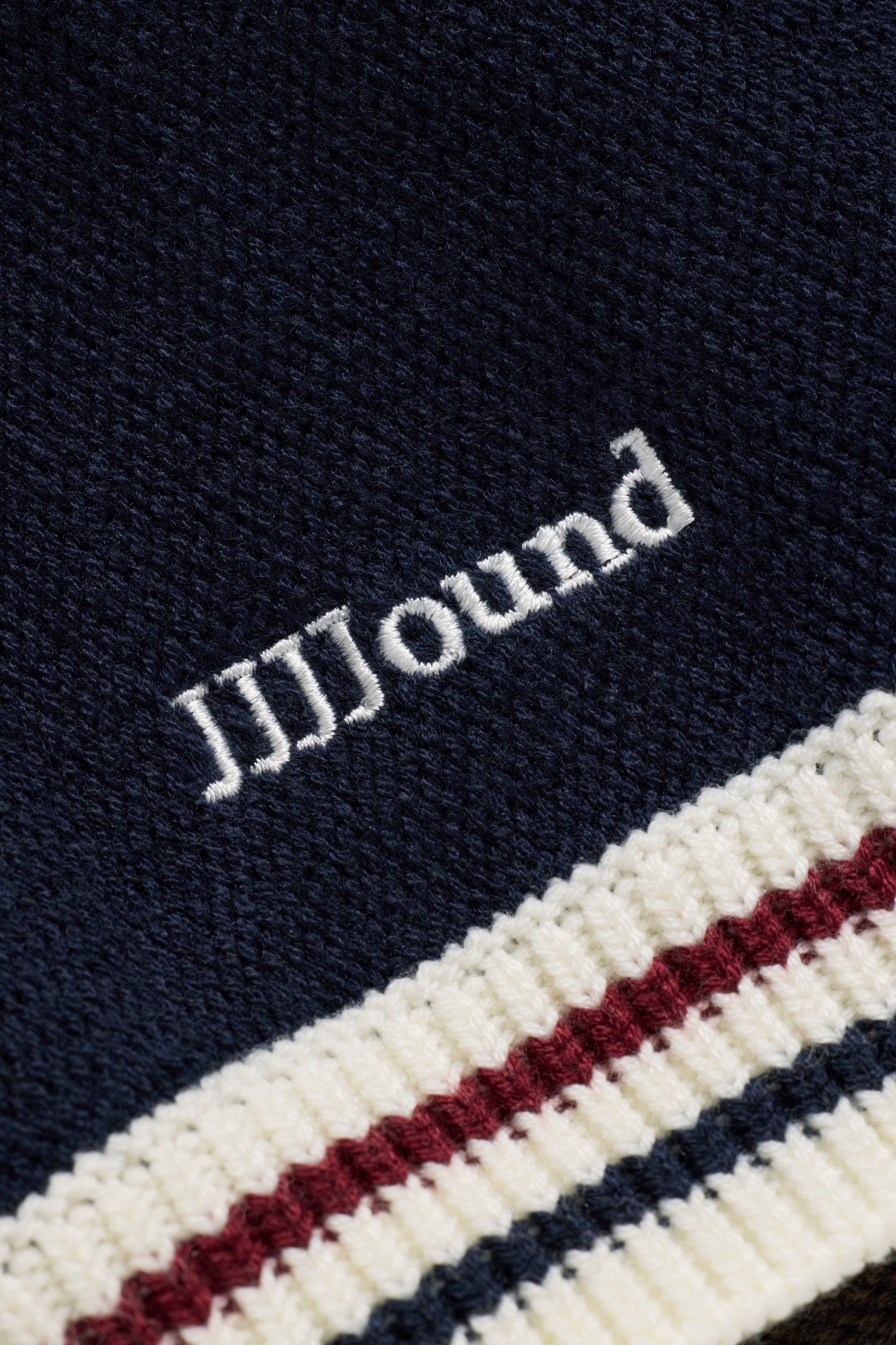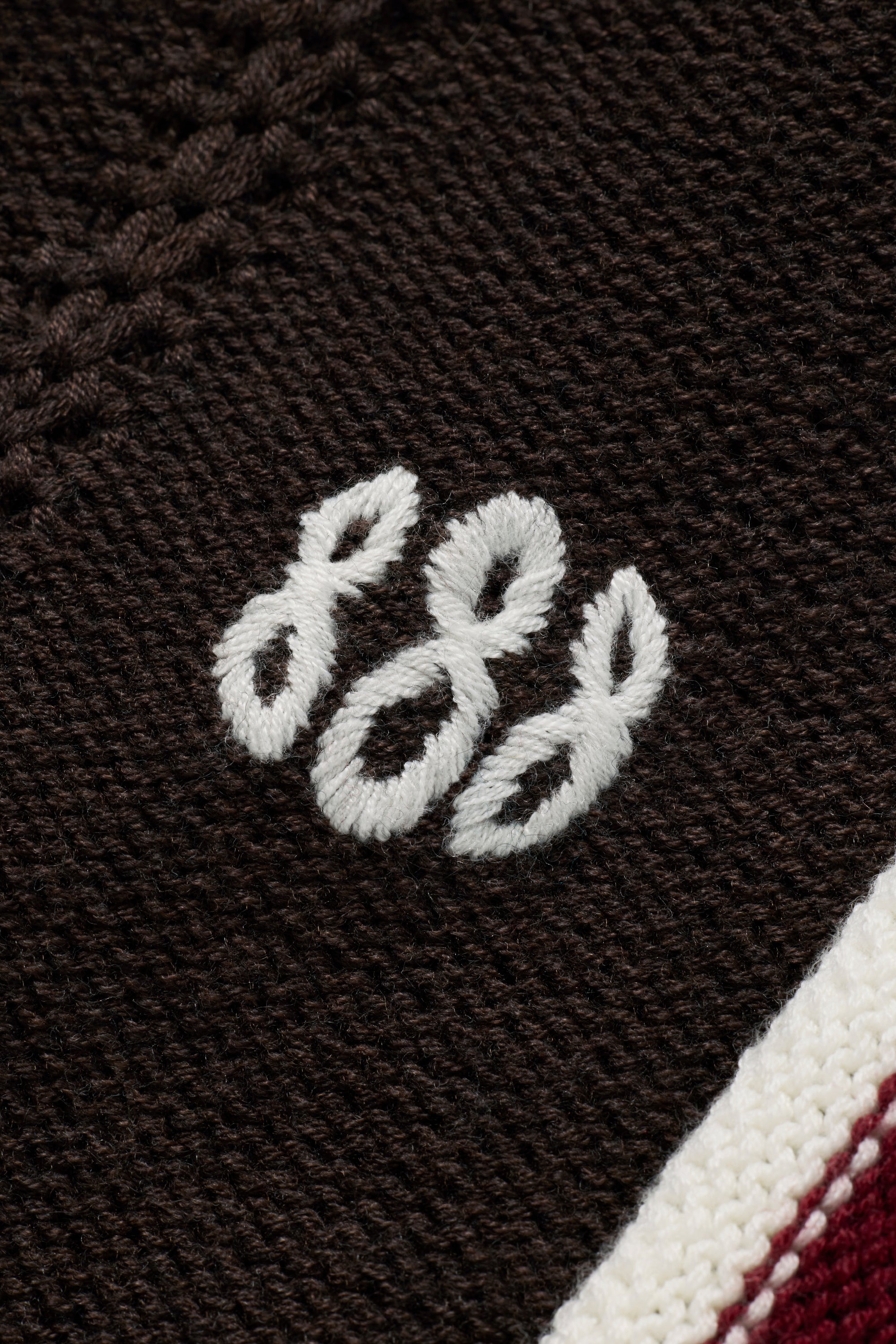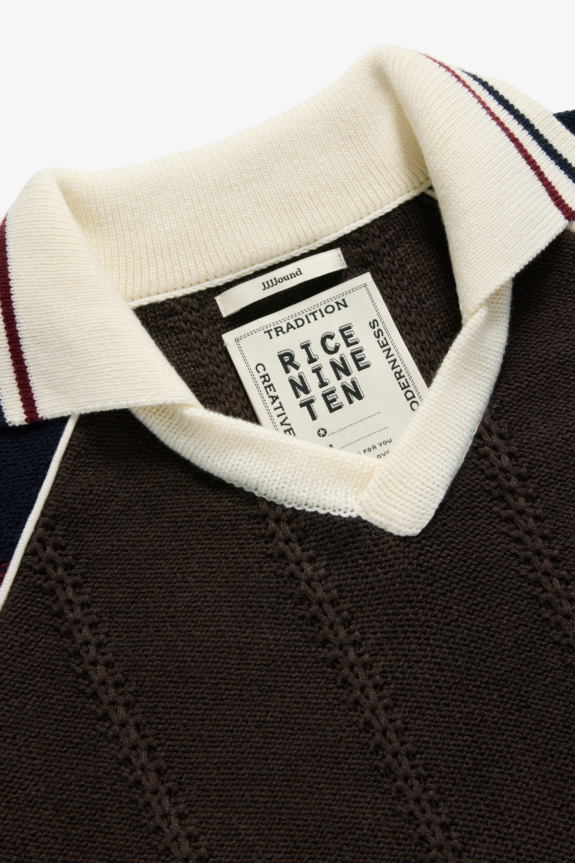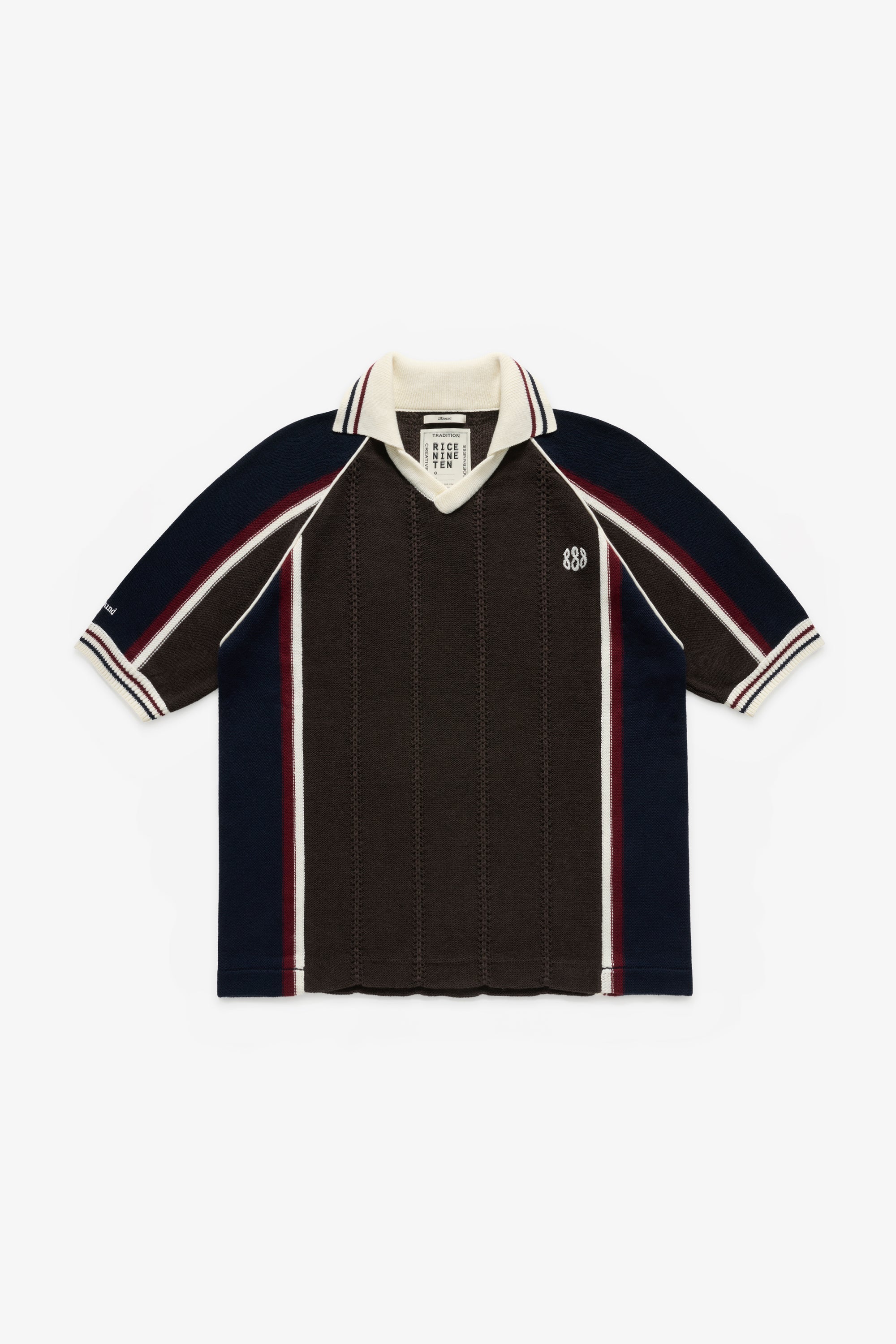 This collaborative short-sleeved knit captures the full detailing of a vintage soccer team jersey—reimagined and hand-knit. The front and back panels are constructed in a textured tuck pattern, while the collar and cuffs are accented with contrasting off-white lines that echo classic team kits. A hand-embroidered 888 emblem sits subtly at the left chest and JJJJound serif logo embroidered on the right sleeve. Made in China, knitted on a home knitting machine, using a blended yarn of polyester, wool, nylon, and acrylic, the jersey combines deep burgundy and navy side panels with a chocolate brown core, finished with ribbed trims and a bespoke RICE NINE TEN label in JJJJound’s signature palette—bridging craftsmanship with collaborative design.